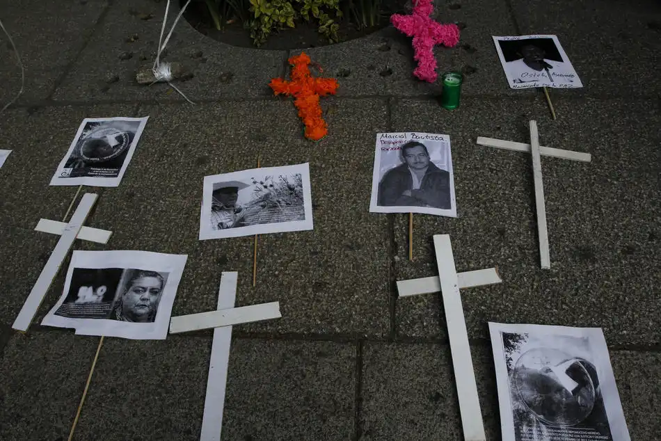 Кресты и фотографии убитых или похищенных бандами людей лежат на тротуаре во время демонстрации в Мехико 11 декабря 2011 года. Люди требуют мира и порядка в городе.