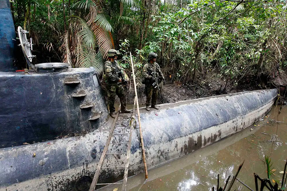 Представители колумбийских ВМС на конфискованной подводной лодке контрабандистов на импровизированной верфи в Тимбикуи, Колумбия, 14 февраля. Подлодка использовалась для перевозки восьми тонн кокаина в Мексику.