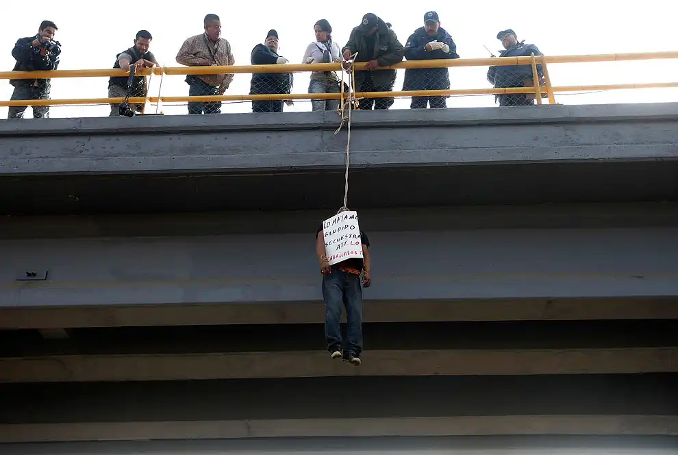 Полицейские и журналисты смотрят на труп мужчины, подвешенный на мосту, в Морелии 17 марта. К телу был привязан плакат с надписью: «Мы убили его, потому что он был грабителем и похищал людей». Подпись – «Рыцари Ордена Храма».
