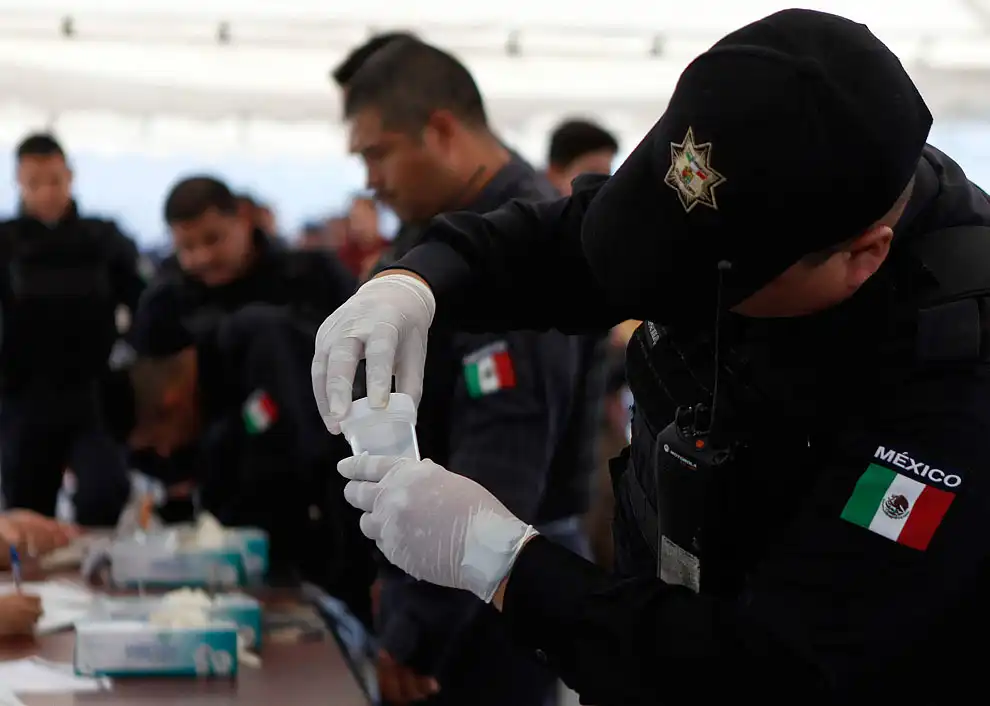 Полицейский держит баночку мочой во время сдачи анализов в Гваделупе. 550 полицейских сдали анализы на наличие наркотических веществ в организме, после того как военные задержали двоих полицейских по подозрению в содействии преступным группировкам.