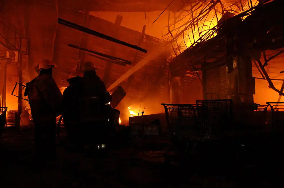 Пожарные борются с огнем в супермаркете после перестрелки между солдатами и преступниками в Акапулько 4 апреля. В результате перестрелки погибли солдат и двое наркодельцов, а супермаркет и прилегающие к нему кинотеатр и магазины были уничтожены. (