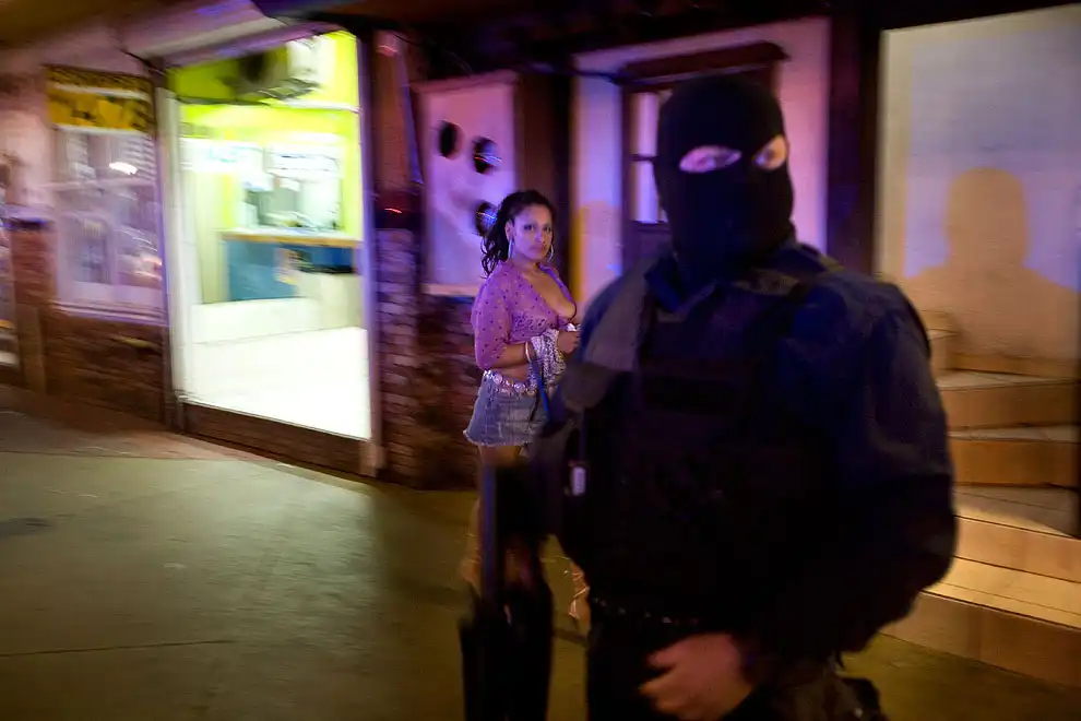 Спецотряд Тихуаны обыскивает автомобили и людей во время ночной облавы.