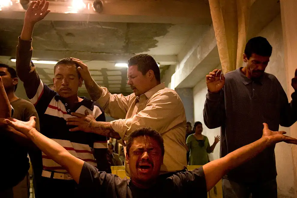 Бывший осужденный, член преступной группировки и покаявшийся убийца Педро Мартин Нунез (в центре в белой футболке) проводил службу в христианской церкви Сьюдад-Хуареса, которой он теперь управляет.
