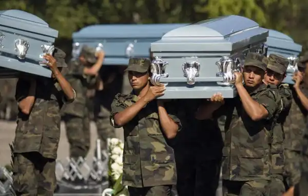 Солдаты несут гробы с телами своих товарищей, которых нашли обезглавленными в Чилпансинго, Мексика. Этот случай был одним ис самых жестоких за все время войны армии с наркомафией.
