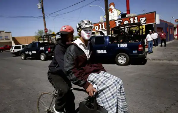Велосипедист проезжает мимо полицейского патруля в Сьюдад Хуарес, 9 апреля 2009 года. Начатая президентом Кальдероном война против наркомафии привела к росту активности преступников.