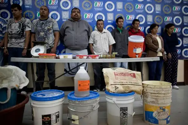 Подозреваемые рядом с контейнерами с метамфетамином и химикатами в Тихуане 12 февраля. По данным полиции Бахи, во время облавы на лабораторию по производству метамфетамина были арестованы девять подозреваемых, работавших на наркосиндикат «Ла Фамилиа».