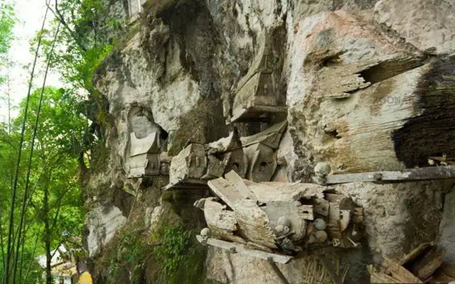 Гробы с умершими, которым не хватило места в скале, висят на ней. Они украшены геометрическими формами, но со временем, когда дерево начинает гнить, обнажаются белые кости. Некоторые члены племени Торайя проявляют изобретательность в надежде сэкономить и хоронят нескольких членов семьи в одном гробу. В конце концов, крепления не выдерживают и ломаются под весом тел. Но, судя по количеству костей в нижней части скалы, это никого не беспокоит.