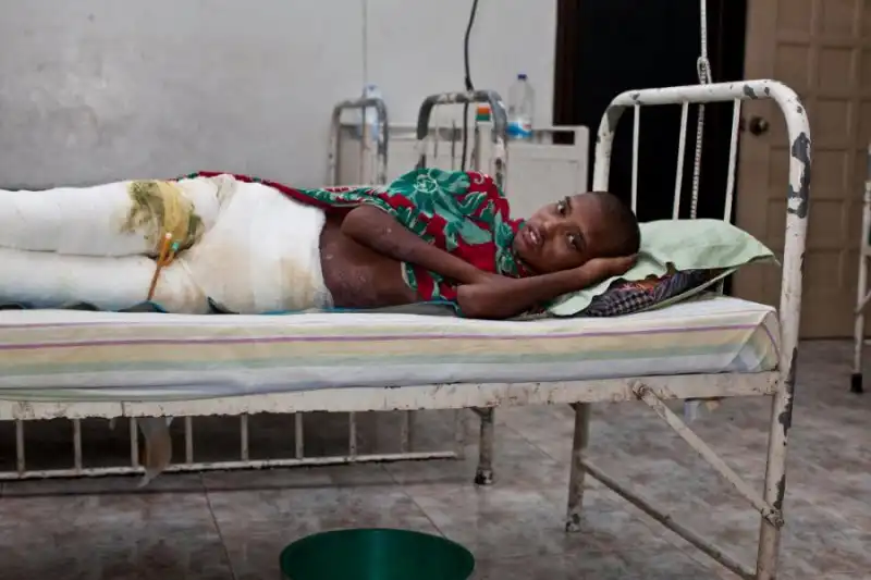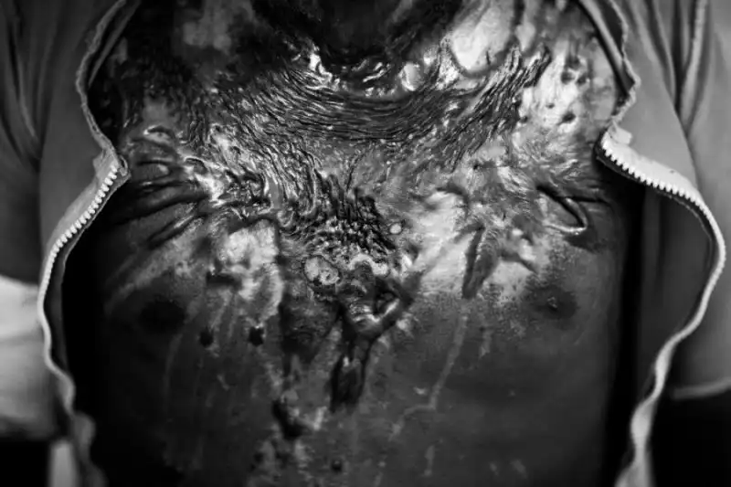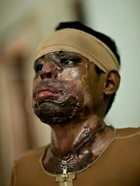 14. Этого малыша зовут Саббер, ему 3 года. Его мать, Лебе, средняя из трех сестер. Муж старшей из сестер захотел жениться на младшей, муж которой недавно погиб. Она отказала ему. Тогда он пошел к Лебе в надежде, что та поможет ему уговорить сестру, но Лебе отказалась ему помогать. В одну из ночей, когда мужа Лебе не было дома, разозленный отказом родственник вылил через окно кислоту на сына Лебе, Саббера. Но этого ему показалось мало и он, ворвавшись в дом, снова плеснул кислоту на малыша и его мать. (Jan Møller Hansen)