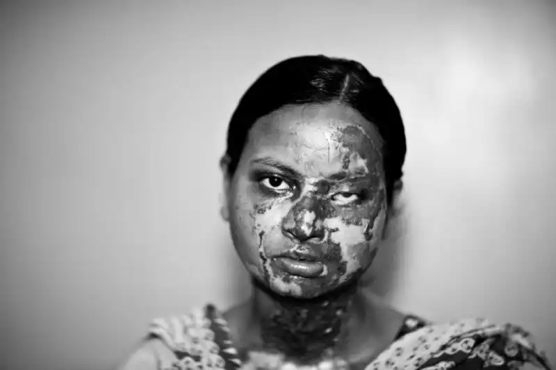 8. Шаназ из Савары, в Дакке. После того как она вышла замуж, младший брат ее мужа потребовал приданое от ее семьи. Но ее отец был бедным, денег у него не было. Кроме того, в браке у Шаназ родилось две девочки, что не понравилось родственникам ее мужа, они ждали от нее сыновей. Это и послужило причиной того, что спустя 8 лет брака младший брат мужа решил ей отомстить. В октябре 2003 года он пришел ночью к ней в дом и вылил на нее кислоту. Шаназ было сделано уже 5 операций в медколледже Дакки и 6 операций в центре в Дакке. У нее нет носа, верхней губы и одного уха, которые теперь нужно восстанавливать. Один глаз Шаназ потеряла полностью, а второй лишь различает свет. Муж от нее отказался и Шаназ поддерживают лишь ее мать и две дочери. И хотя Шаназ сразу же подала иск в суд против младшего брата своего мужа, но спустя 8 лет, виновный так и не наказан. (Jan Møller Hansen)