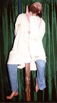 “Там стоит корзина, накрытая куском полотна, в которой лежит набор ножей. Каждый из этих ножей предназначен для определенной части тела, о чем свидетельствуют выгравированные на клинке надписи. Палач берет наугад из корзины один из ножей и, исходя из надписи, отрезает соответствующую часть тела. Однако в конце прошлого века подобная практика, по всей вероятности, была вытеснена другой, не оставлявшей места случайности и предусматривавшей отрезание в определенной последовательности частей тела при помощи единственного ножа. По словам сэра Генри Нормана, осужденного привязывают к подобию креста, и палач медленно и методично срезает сначала мясистые части тела, затем надрезает суставы, отрезает отдельные члены на конечностях и заканчивает казнь одним резким ударом в сердце...