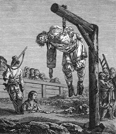 Средневековая виселица состояла из специального постамента, вертикального столба (столбов) и горизонтальной балки, на которой и вешали приговоренных, размещенной над подобием колодца. Колодец был предназначен для отваливающихся частей тела - повешенные оставались висеть на виселице до полного разложения.
