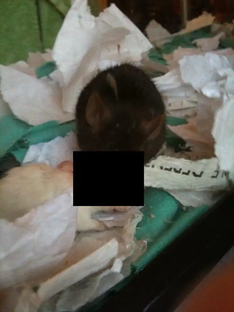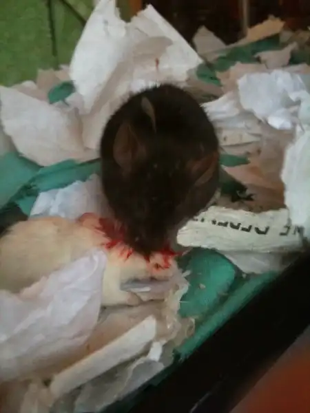 30 минут до этого две мышки мило играли у себя в клетке и в один момент одна решила и выжрала мозг второй... Мышиный зомби-апокалипсис начался...