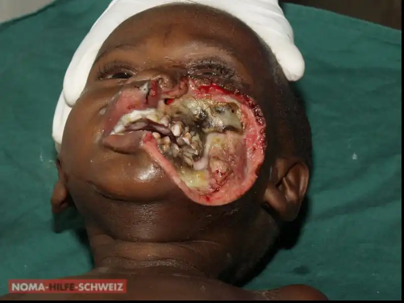 В наиболее тяжелых случаях процесс переходит на язык, небо, губу и на противоположную сторону. Гангренозный процесс распространяется также и на кожу лица, поражая всю щеку, пирамиду носа, и может распространяться до глазницы и, как ползучая, не знающая преград язва, распространяться на глазное яблоко и костные образования верхней челюсти. А.И.Макаренко так описывает процесс разрушения номой лицевой области.