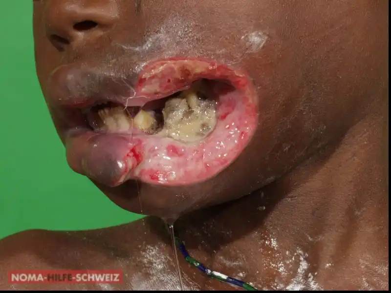 Распад тканей прогрессирует, образовавшийся дефект щеки увеличивается, обнажаются челюсти, зубы, язык; отмечается выделение гнилостного экссудата, обильная саливация.
