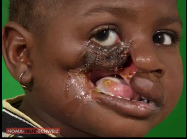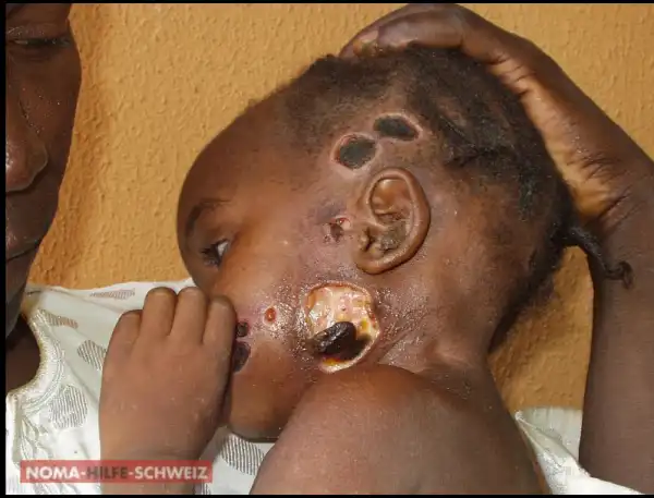 Заглатывание продуктов гнилостного распада тканей вызывает желудочно-кишечные расстройства, аспирация их ведет к возникновению легочных осложнений (пневмония, гангрена легкого). Однако нома может протекать и доброкачественно. При доброкачественном течении процесс может ограничиться изъязвлением участка слизистой оболочки полости рта или образованием дефекта щеки и крыла носа большей или меньшей величины с последующим рубцеванием. Однако процесс очищения раневой поверхности и рубцевания раны протекает медленно, напоминая аналогичный процесс при поражении ионизирующим излучением. На месте погибших тканей образуются глубокие дефекты.