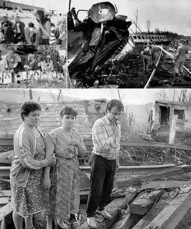 — В небо взметнулось пламя, стало светло, как днем, мы подумали, сбросили атомную бомбу, — говорит участковый Иглинского ОВД, житель поселка Красный Восход Анатолий Безруков. — Помчались к пожарищу на машинах, на тракторах. Техника на крутой склон подняться не могла. Стали карабкаться на косогор — кругом сосны стоят, как обгоревшие спички. Внизу увидели рваный металл, упавшие столбы, мачты электропередачи, куски тел... Одна женщина висела на березе со вспоротым животом. По склону из огненного месива полз, кашляя, старик.