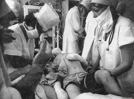 Вышли из машины на пепелище, первое, что видим, — кукла и оторванная нога... — рассказывал врач “Скорой помощи” Валерий Дмитриев. — Сколько пришлось обезболивающих уколов сделать — уму не постижимо. Когда с ранеными ребятишками тронулись в путь, ко мне подбежала женщина с девочкой на руках: “Доктор, возьмите. У малышки погибли и мать, и отец”. Мест в машине не было, я посадил девочку к себе на колени. Она была закутана по самый подбородок в простынку, головка ее была вся обожжена, волосики свернулись в запекшиеся кольца — как у барашка, и пахла она, как жареный барашек... До сих пор этой девчушки забыть не могу. По дороге она рассказала мне, что зовут ее Жанна, и что ей три года. У меня тогда дочке было столько же лет. Сейчас Жанне должно быть уже 21, совсем невеста...