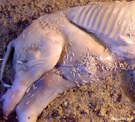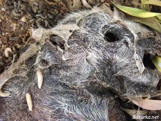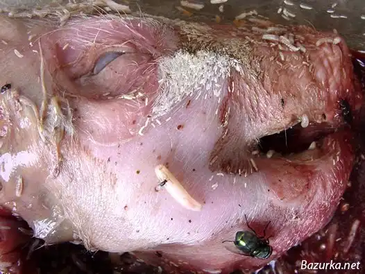С момента смерти, мух привлекают органы. Без нормальной защиты живых животных, мясные мухи и обычные мух способны откладывать яйца вокруг раны и естественные отверстия тела (рот, нос, глаза, анус, гениталии). Из яиц вылупляются личинки и проникают в организм, в течение 24 часов. Жизненный цикл мухи от яйца до личинки, занимает от двух до трех недель. Это может занять значительно больше времени при низких температурах.