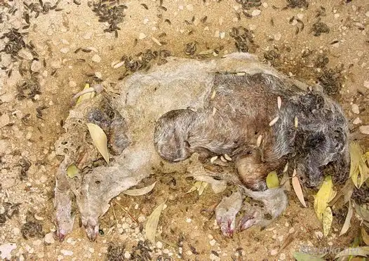 4. Этап разложения: от 10 до 20 дней. Раздутые тело в конечном итоге разрушается, оставляя за собой уплощенное тело, чье мясо имеет кремообразную консистенцию. Открытые части тела черного цвета и присутствует очень сильный запах разложения.