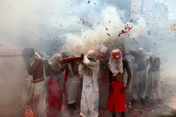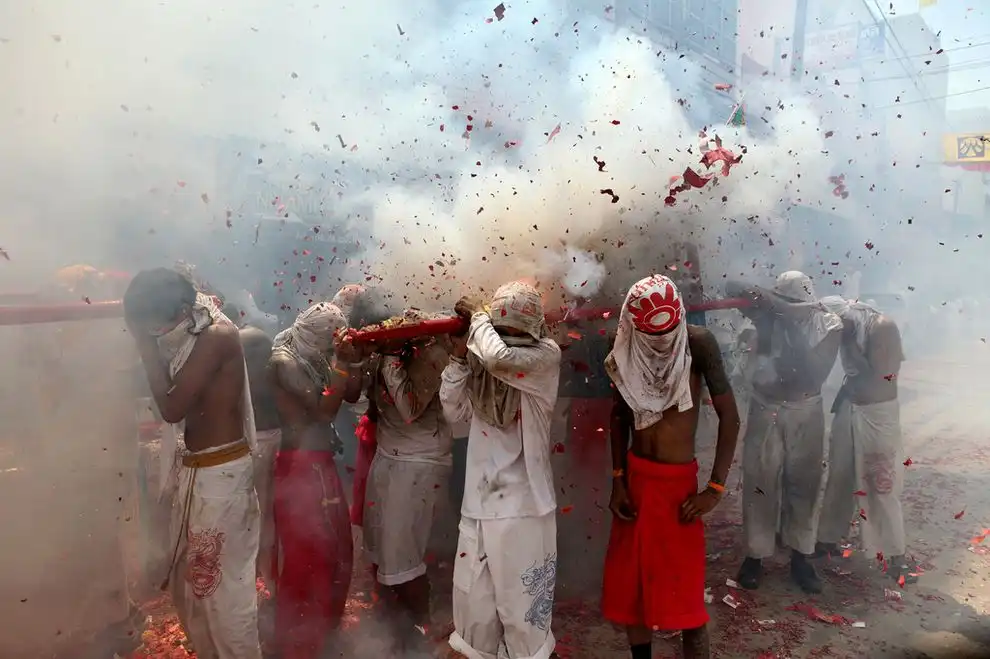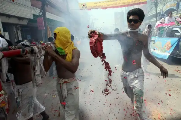 После процедуры “пирсинга” начинается шествие, которое сопровождается взрывами множества самодельных мини-бомб и хлопушек.