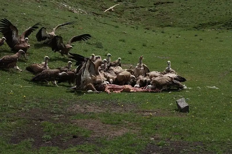 Рогьяпа сначала делает множество надрезов на теле и уступает тело птицам – стервятники делают основную часть работы, поедая всю плоть.