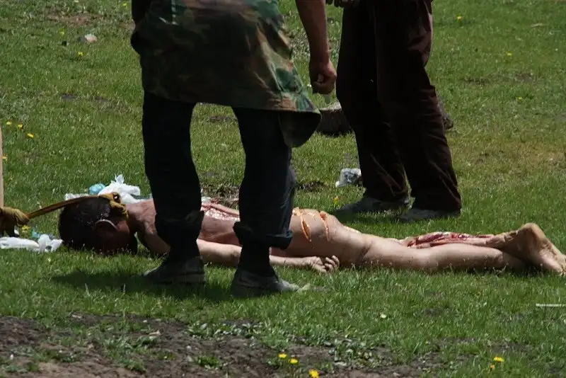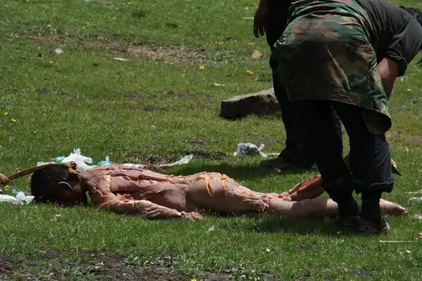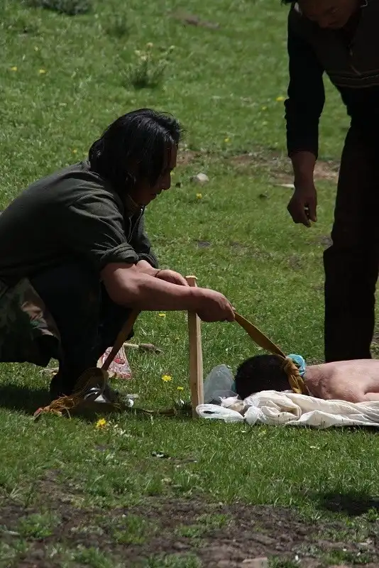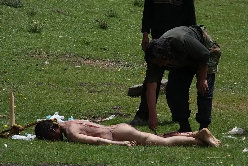Труп умершего родственника привязывают за шею к вбитому в землю колу, чтобы грифы не могли утащить останки. После этого кожу покойника надрезают — так пернатым удобнее есть