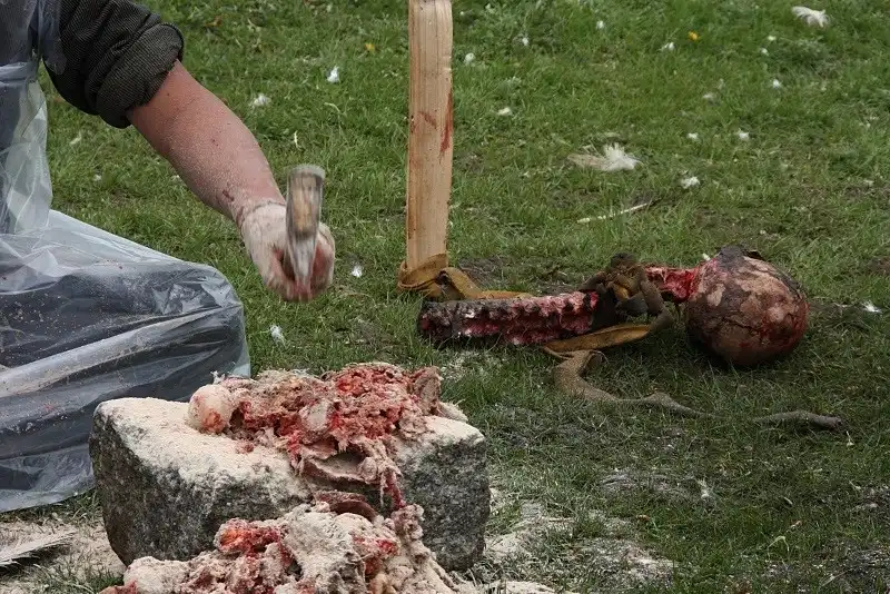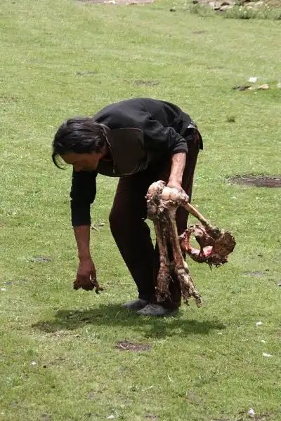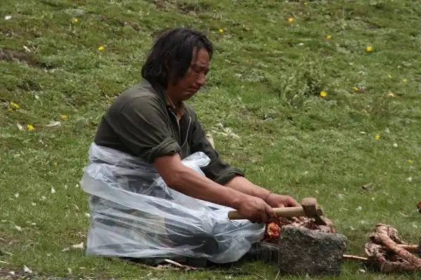 Далее «могильщик» собирает и дробит кости на специальном плоском камне, смешивает крошево с цампой (ячменная мука с маслом яка) и скармливает все это птицам.