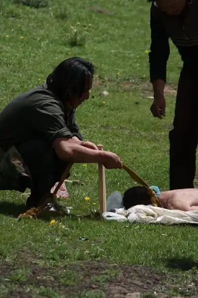 Когда тибетец умирает, его тело устанавливают в сидячее положение и так он «сидит» в течение 24 часов, пока лама читает молитвы из тибетской Книги мёртвых.
