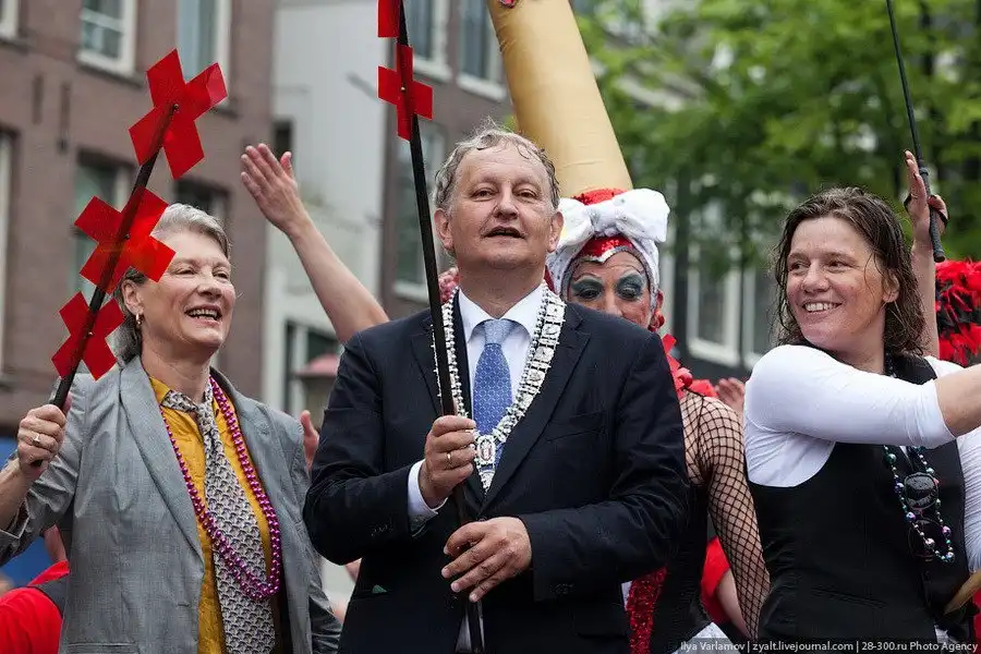 Открывал парад мэр Амстердама Эберхард ван дер Лан. Он держал в руках табличку с надписью "I glambtenaar", что можно перевести, как "Я гламурный чиновник".