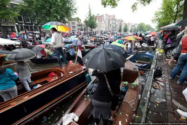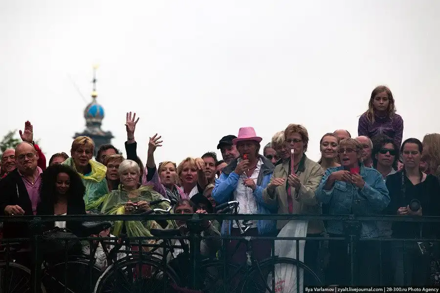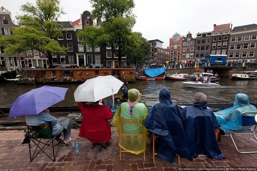 К сожалению, в этот раз был дождь, зрителям пришлось помокнуть. В этот раз, не смотря на ужасную погоду и сильный дождь, около 380 000 человек собрались вдоль каналов Амстердама, чтобы стать свидетелями кульминационного события недели гей-прайда. В прошлом году было рекордное число зрителей за всю историю - 560 000.