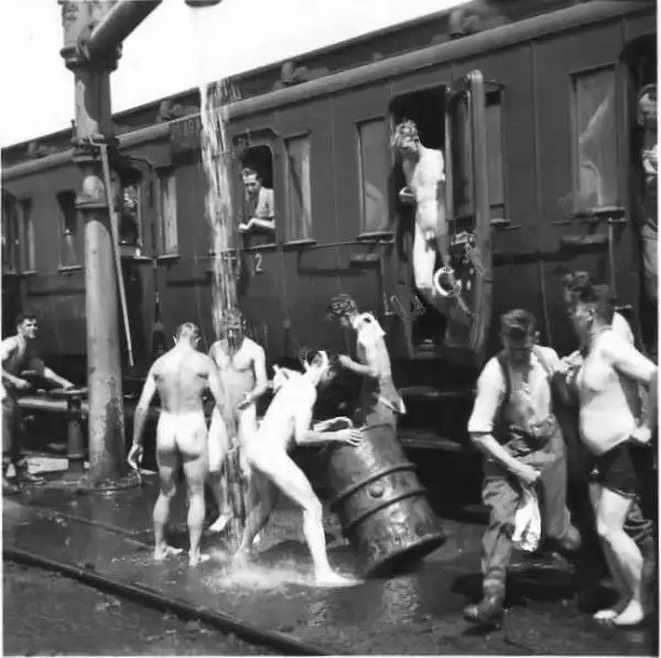 Немецкие солдаты принимают душ на железнодорожной станции под заправочным краном с водой для локомотивов. Судя по всему это начало войны, когда на головы и задницы немцев сверху вместе с водой еще не падали бомбы.