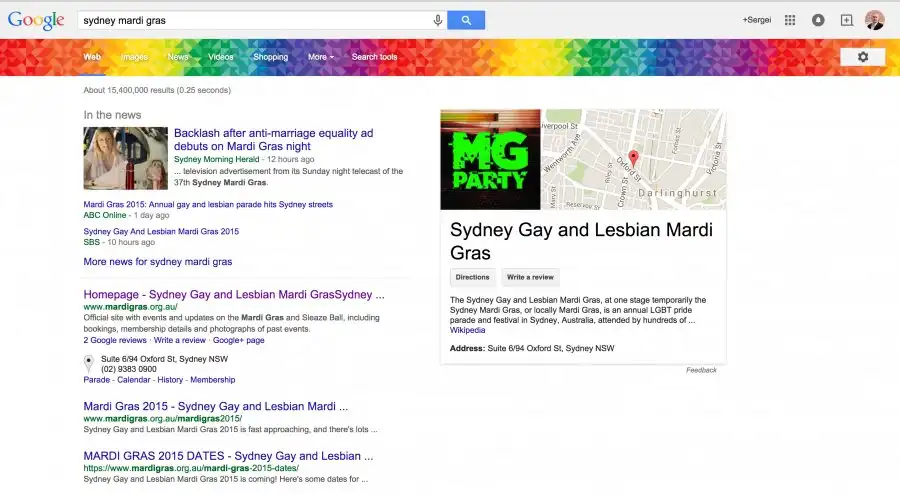 Более того, Гугл, в день парада, даже изменил страницу поиска по терминам на гей-тематику, вот на такую веселенькую страничку. По всем другим терминам, Гугл выдавал запрос как обычно.