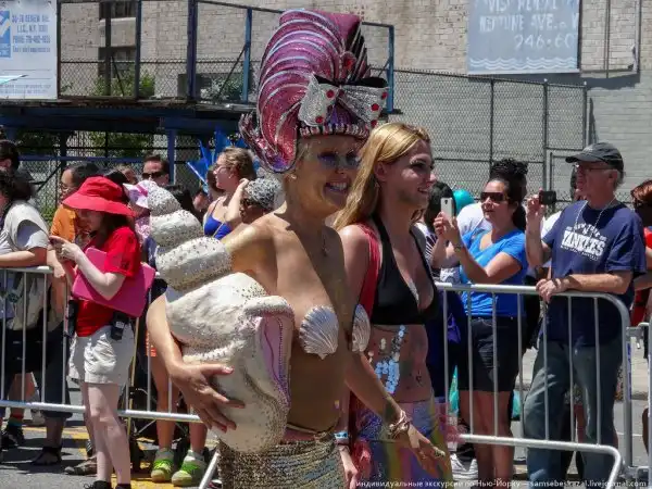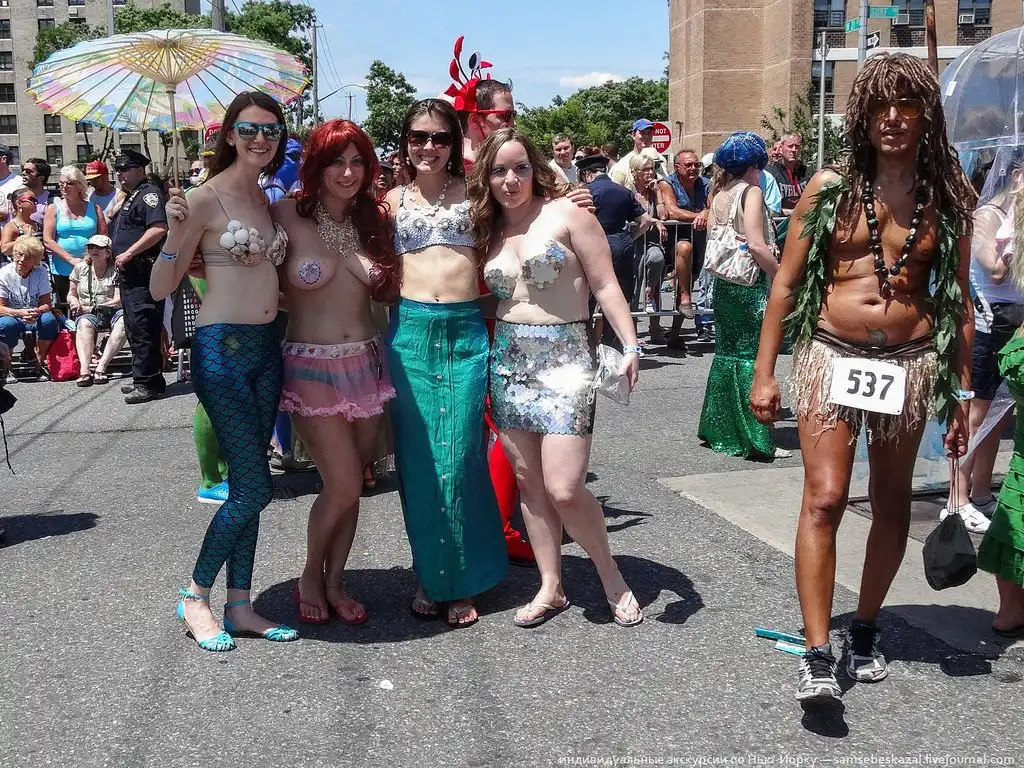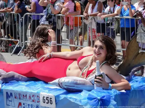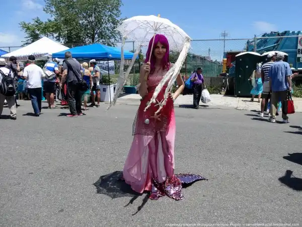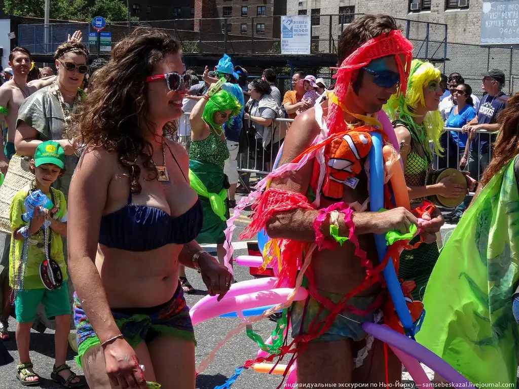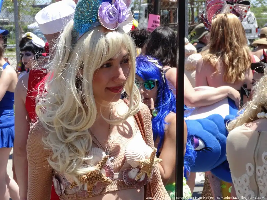 Мероприятие на котором Кончита Вурст не пробилась(лся) бы даже в призовую тройку. Бородатые тетки тут ходят табунами, а на женщин с голой грудью уже давно никто не обращает совершенно никакого внимания. Чтобы удивить зрителей своим внешним видом надо как-то по-настоящему отличится. С сегодняшнего дня я уверенно вычеркиваю из лидеров по количеству собирающихся фриков всякие там гей-парады в Амстердаме. У меня появился новый герой. И имя ему "Парад русалок на Кони-Айленде".