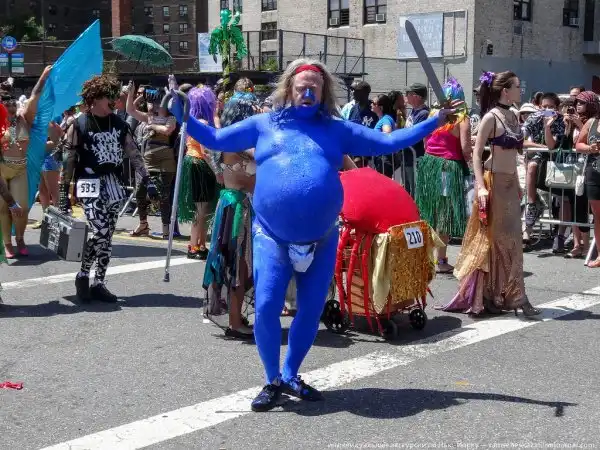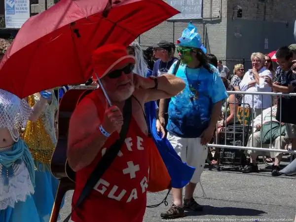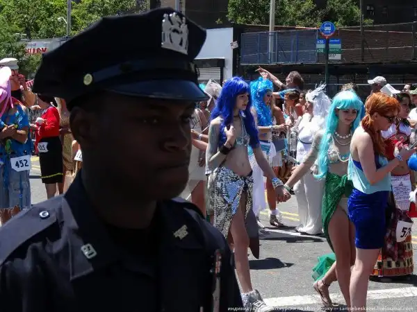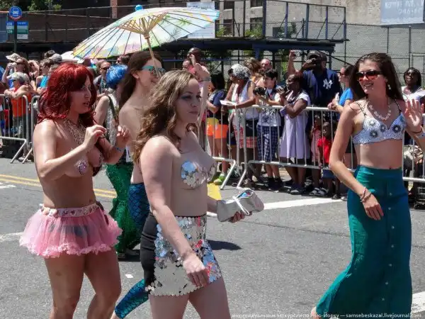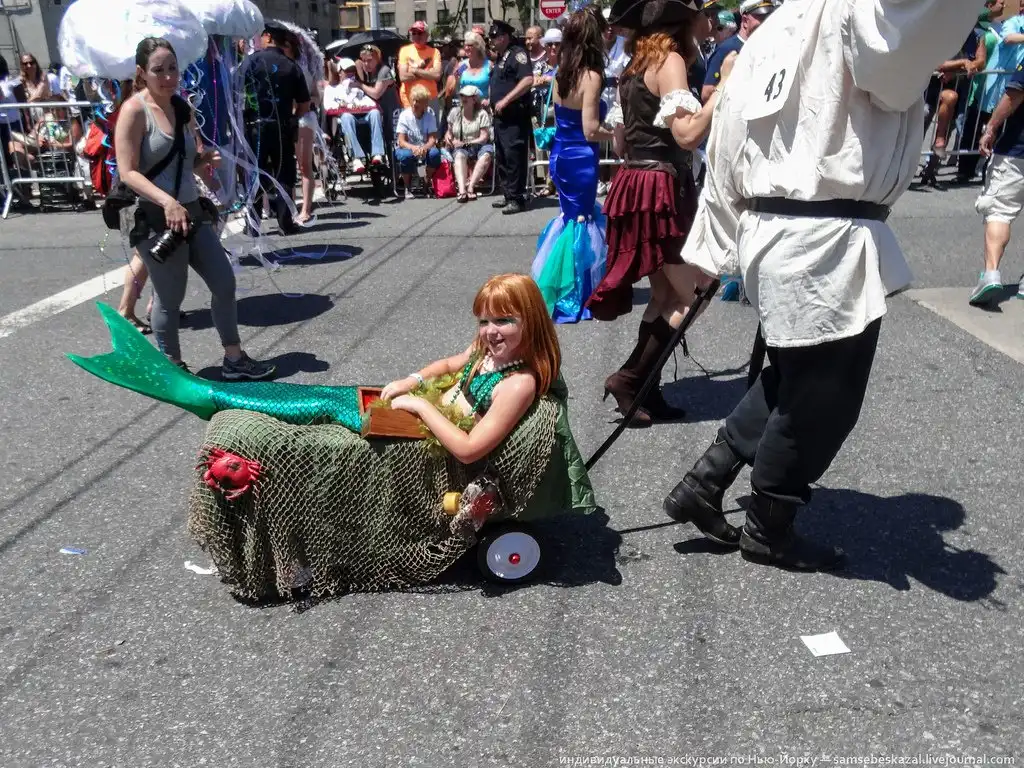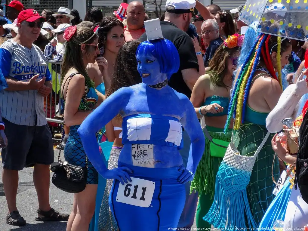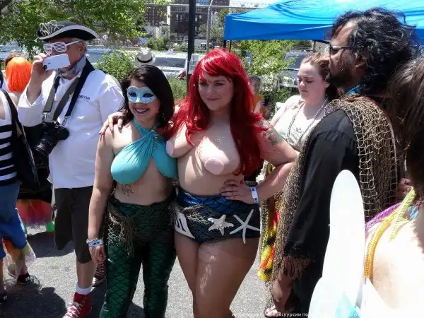 Мероприятие на котором Кончита Вурст не пробилась(лся) бы даже в призовую тройку. Бородатые тетки тут ходят табунами, а на женщин с голой грудью уже давно никто не обращает совершенно никакого внимания. Чтобы удивить зрителей своим внешним видом надо как-то по-настоящему отличится. С сегодняшнего дня я уверенно вычеркиваю из лидеров по количеству собирающихся фриков всякие там гей-парады в Амстердаме. У меня появился новый герой. И имя ему "Парад русалок на Кони-Айленде".