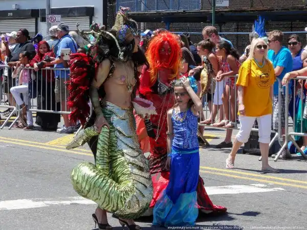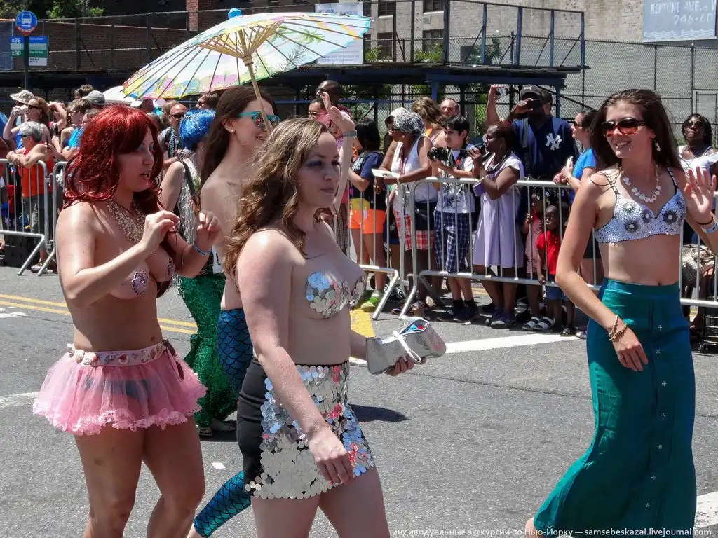 Краткое и, в общем-то, не особенно нужное введение. Парад проводится каждый год в середине июня, начиная с 1983 года и символизирует начало высокого пляжного сезона. Проходит в Нью-Йорке, в районе Кони-Айленд, на самом берегу океана. Маршрут шествия начинается на Серф-авеню (на фото) и заканчивается на бордвоке (деревянный настил вдоль пляжа). В 2013 году парад чуть не отменили из-за недостатка средств (из-за последствий урагана Сэнди), но практически в последний момент необходимая сумма была собрана на Кикстартере. Парад традиционно собирает большие толпы зрителей и участников, которые одеваются в костюмы русалок. Вот собственно и все, что вам нужно знать о параде.