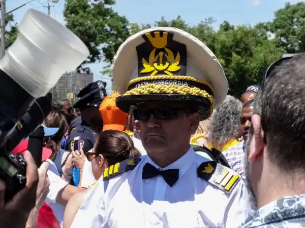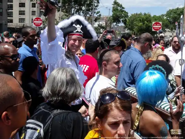 Мужик в пиратской шляпе это мэр Нью-Йорка Бил ДеБлазио.