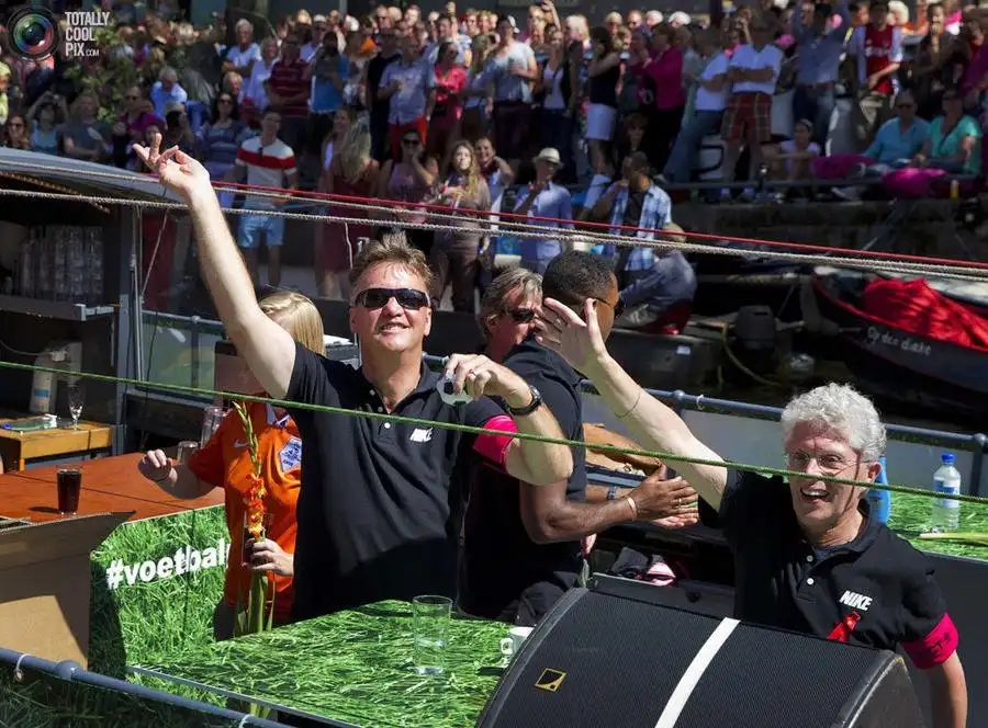 Тренер Национальной футбольной Нидерландов ван Гааль и голландский телеведущий д’Анкона машут с баржи во время ежегодного гей-парада в Амстердаме.