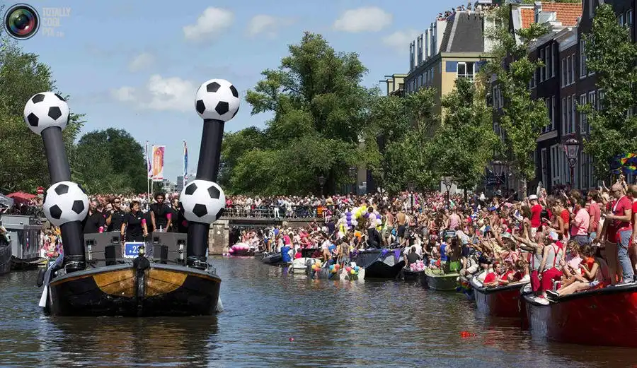 Баржа футбольной ассоциации Royal Dutch плывет вниз по каналу Принсенграхт во время ежегодного гей-парада в Амстердаме.