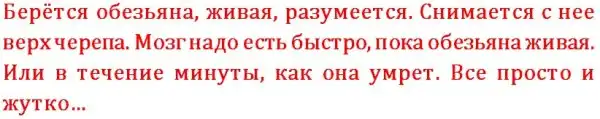 Говорят в Гонконге есть ресторан, где блюдом называют… живую обезьяну. Вернее, ее мозг. Животное сажают под стол, а голову просовывают в специальное отверстие и прочно закрепляют, чтобы обезьяна не вырвалась. Затем официант сбривает шерсть на ее голове. Молоточком и стамеской пробивают череп и снимают его верхнюю часть. Мозг надо есть ложечкой, пока несчастное существо еще живое…