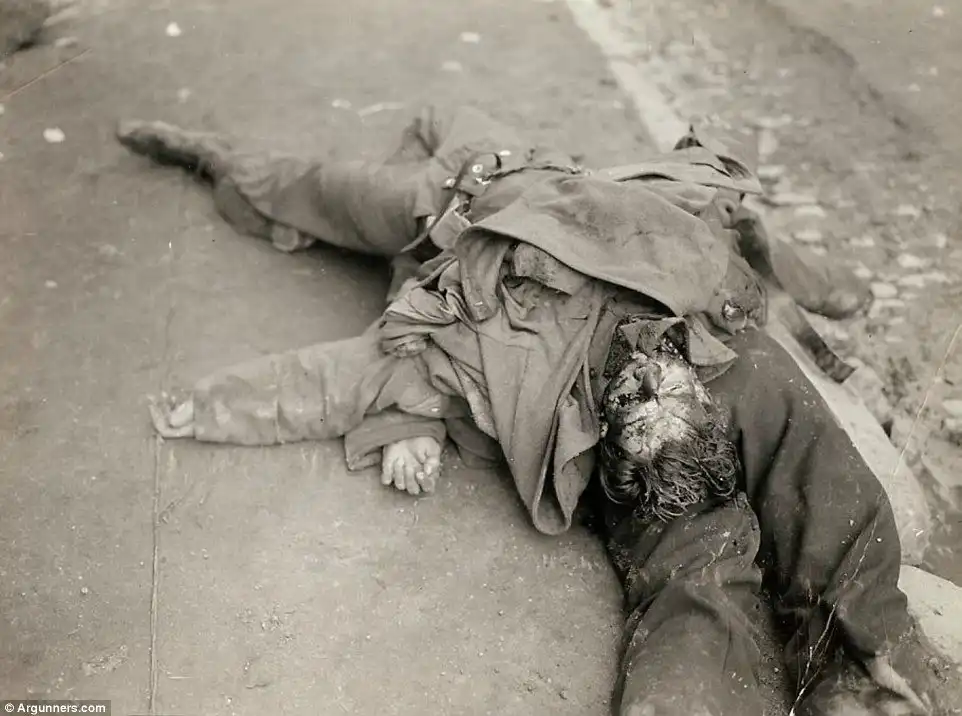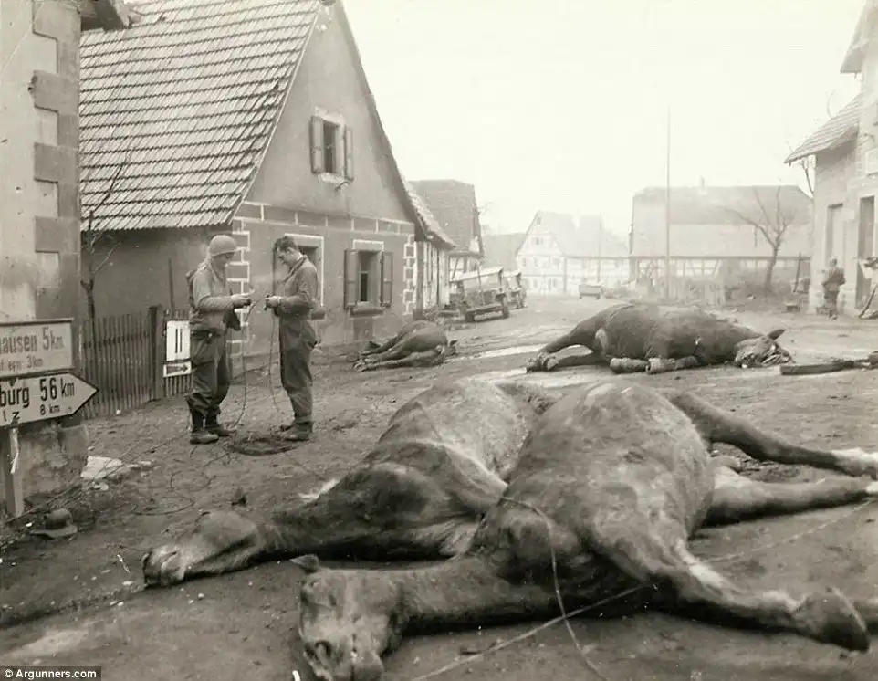Туши лошадей, убитых вместе с пятью немецкими артиллеристами, лежат на улице.