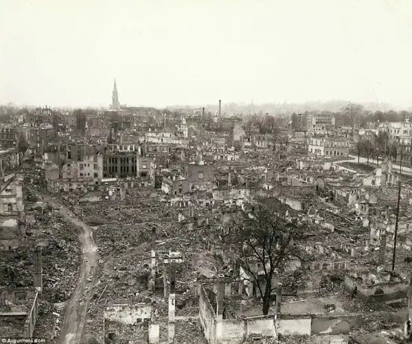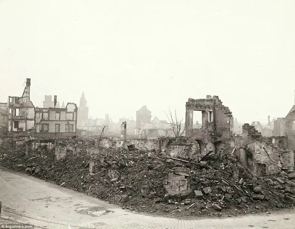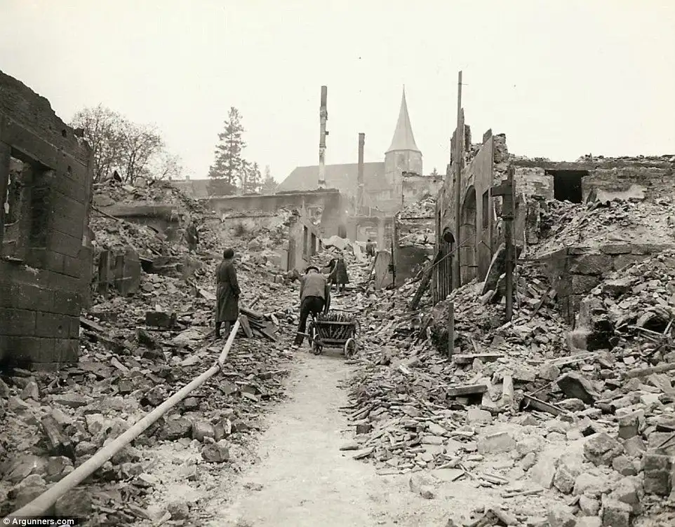 Немецкие гражданские жители начинают разбирать завалы после бомбардировки города.