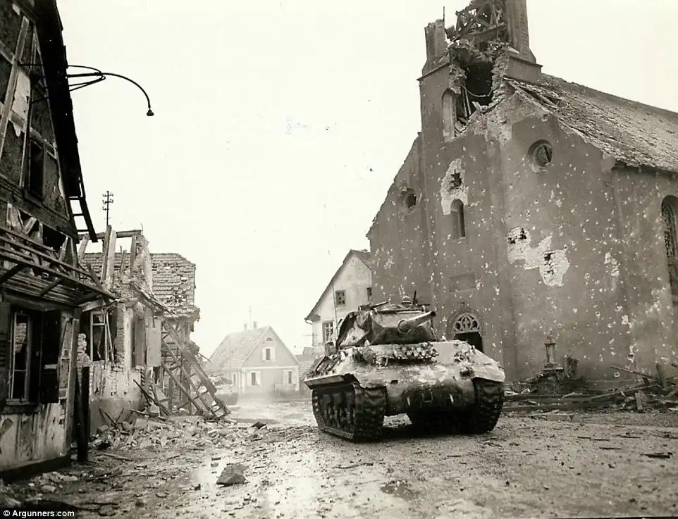 Американский танк едет по разгромленной улице в Рорвиллере, Франция, 4 февраля 1945 года.