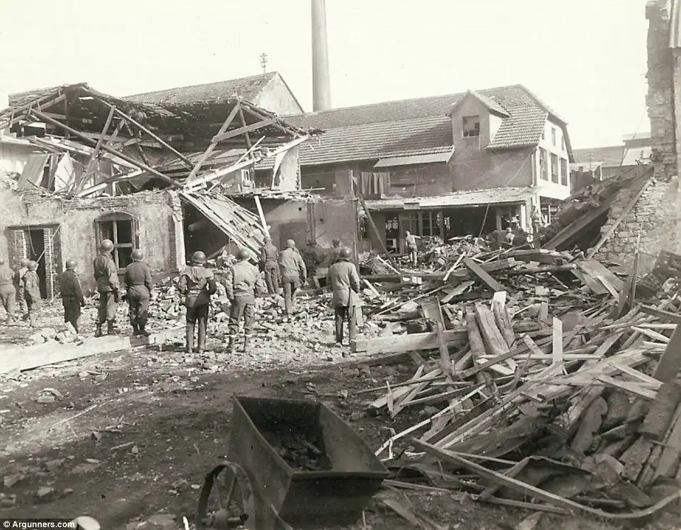 Американские солдаты обыскивают здания, где могли бы прятаться или удерживать пленных немецкие солдаты, после сражения, которое длилось три дня.