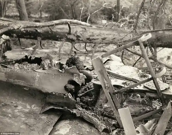 Обгоревшее тело немецкого пилота, самолёт которого был сбит в первый день наступления 7-й армии США в Германии 15 марта 1945 года.