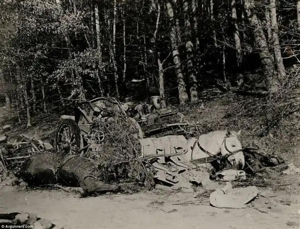 Мёртвые лошади и снаряжение на дороге недалеко от города Луг в Германии после атаки армии США.