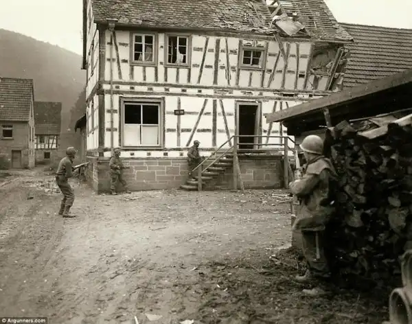 Солдаты 7-й армии США осматривают дом в поисках снайперов в Бозентале, Германия.