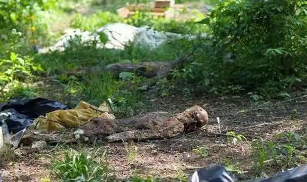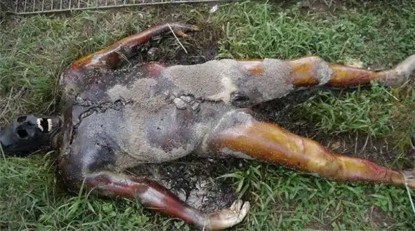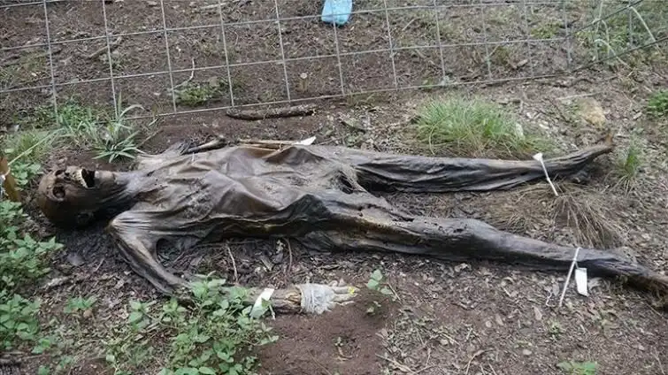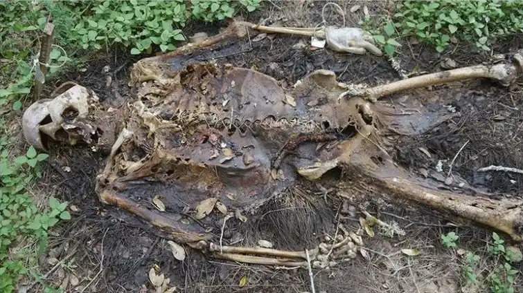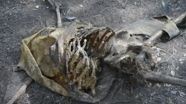 Так выглядит тело, которая разлагалось, не находясь при этом под клеткой. Грудная клетка, которую вы можете видеть на фото выше, является результатом воздействия на тело стервятников и прочих животных.