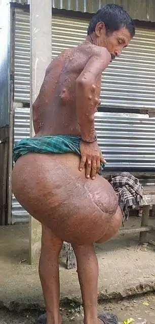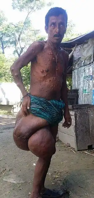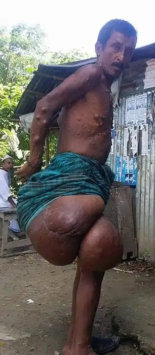 Тело 53-летнего Харуна Патвари из Бангладеш покрыто множеством опухолей, самая большая из которых выросла на правом бедре мужчины - ее вес составляет 38 кг. Из-за своего состояния Харун не может работать и самостоятельно передвигаться, а потому все заботы лежат на плечах его 49-летней жены.